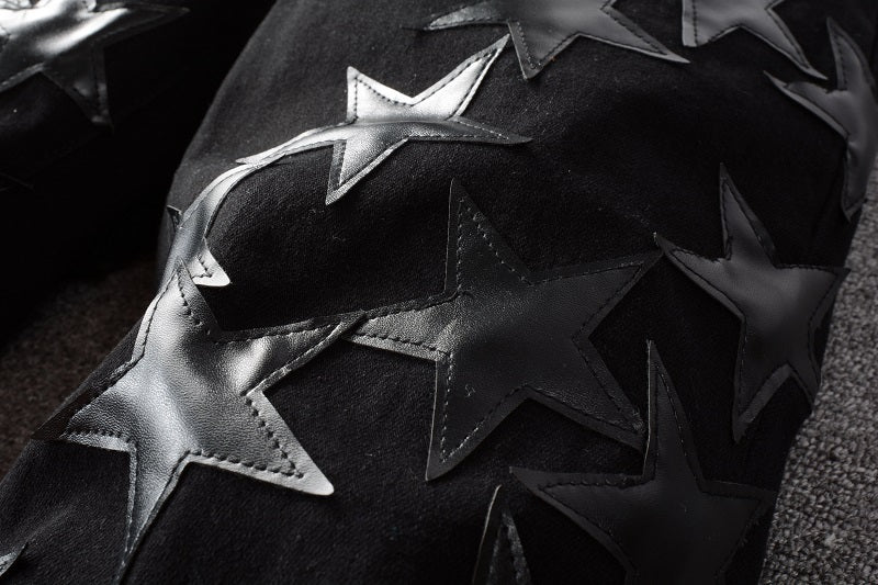 PF22 COLLECTION ITALIAN STRETCH DENIM. FEATURING LEATHER DISTRESSED PATCHES.