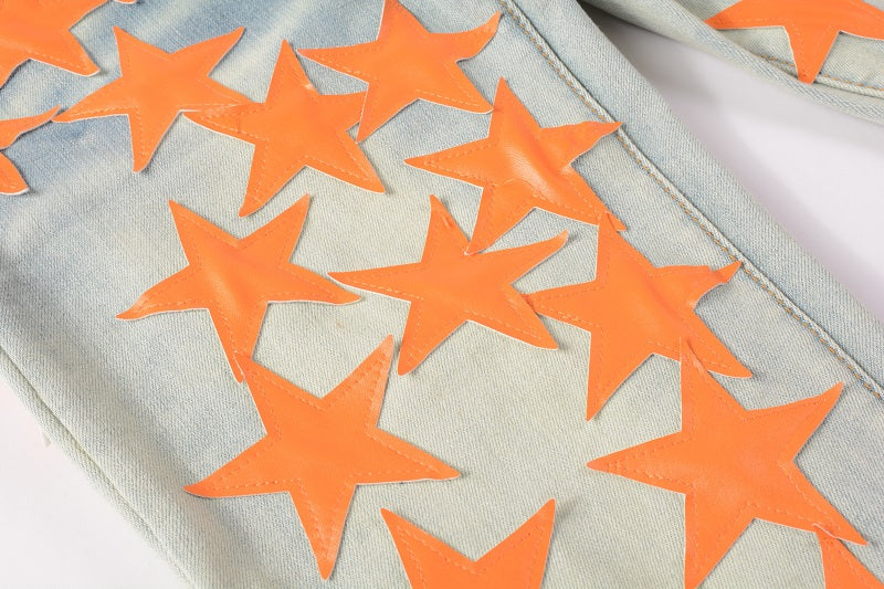 PF22 COLLECTION ITALIAN STRETCH DENIM. FEATURING LEATHER DISTRESSED PATCHES.