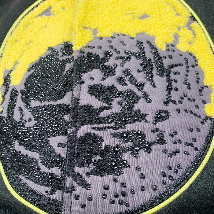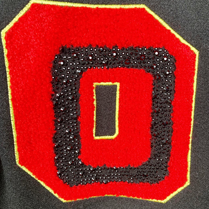 Black varsity featuring yellow and red OW and lunar patches at front. Black leather sleeves with multicolors lunar and arrows patches. Spread collar. Buttons as closure. Multicolors lunar stamp patches at back.
