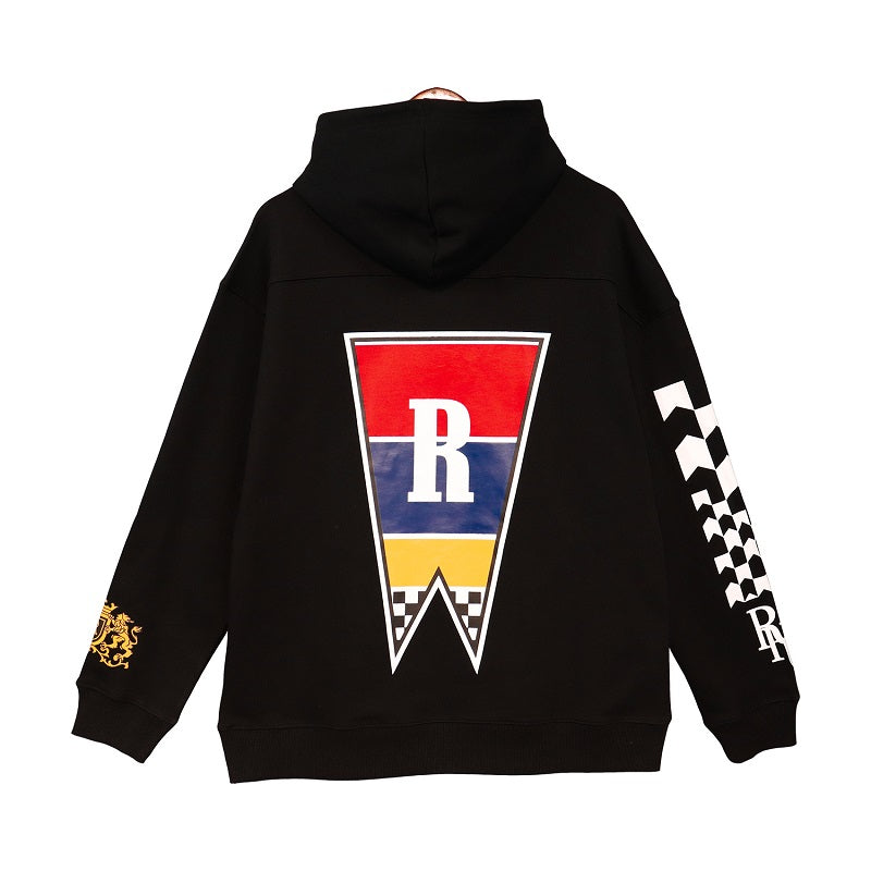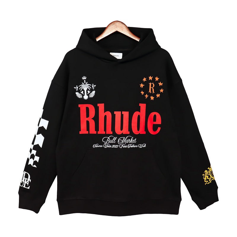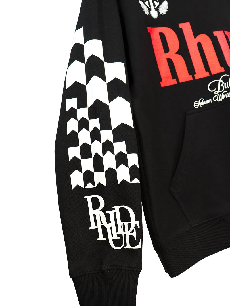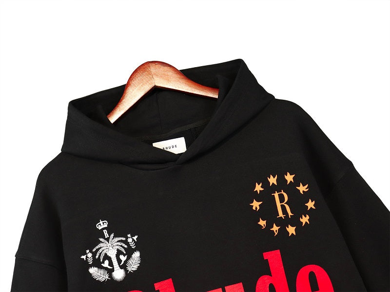 LONG SLEEVE FRENCH TERRY HOODIE WITH "RHUDE CLASSIQUE" GRAPHICS PRINTED THE FRONT AND BACK. FEATURING A KANGAROO FRONT POCKET AND DROPPED SHOULDERS. EACH PIECE IS UNIQUE AND INTENTIONAL PRINT DISTRESSING MY VARY PER STYLE.